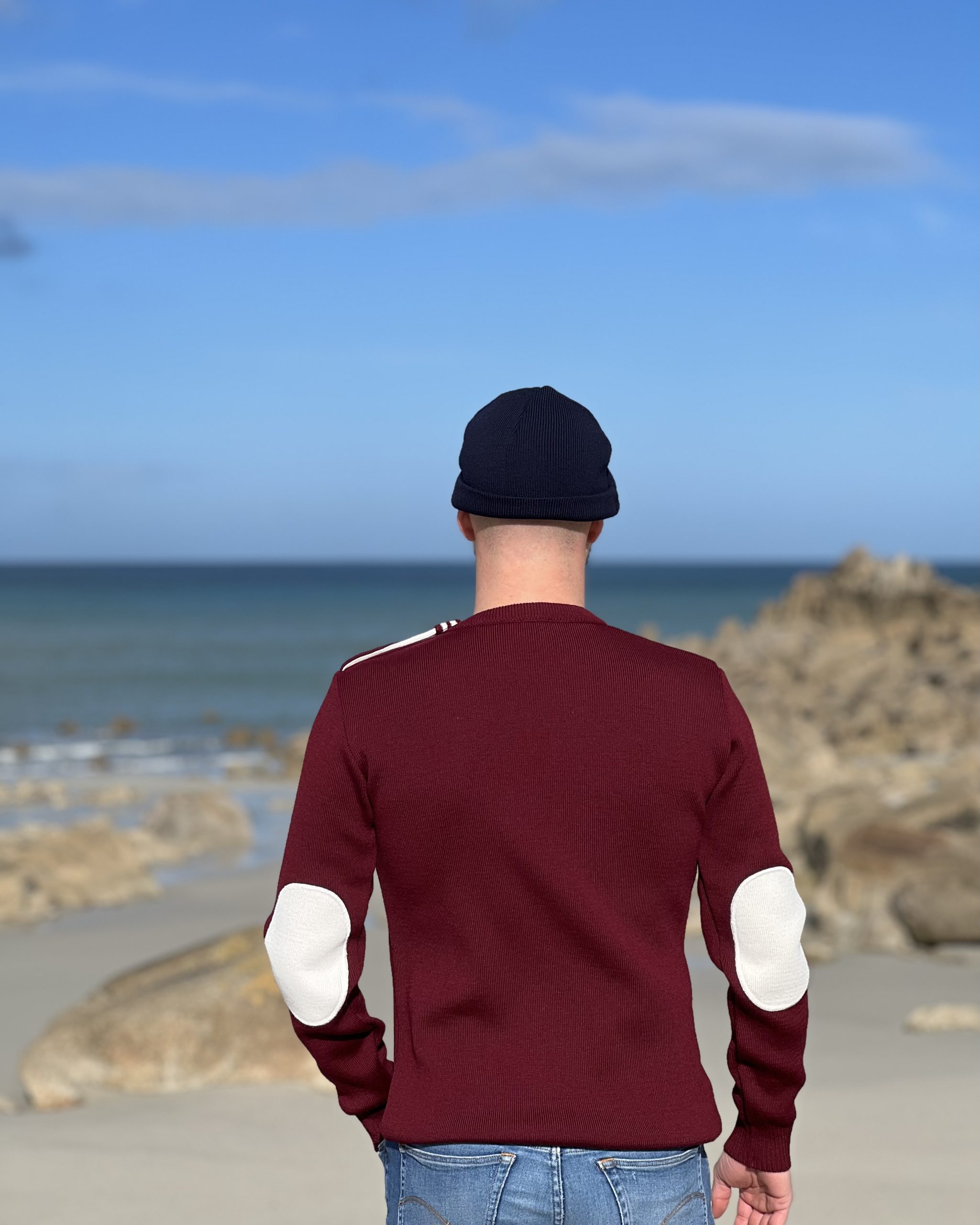 Pull marin homme PETRA, couleur bordeaux avec coudes blancs, fabriqué en France. Boutons en olivier et coupe droite pour un confort optimal et un style élégant. Sa composition 50 % laine / 50 % acrylique assure chaleur, douceur et durabilité pour un usage quotidien.